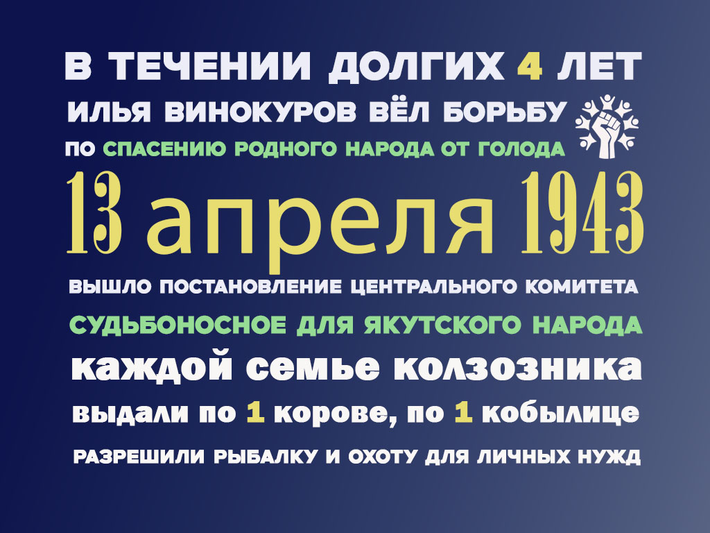 Размер демографической катастрофы для якутского народа имел бы еще большие размеры, если бы не деятельность Винокурова И.Е. Будучи заместителем председателя СНК ЯАССР, Илья Егорович, в октябре 1942 года, нарушая жесткую служебную субординацию, напрямую обратился к руководству страны с призывом о помощи.